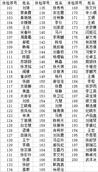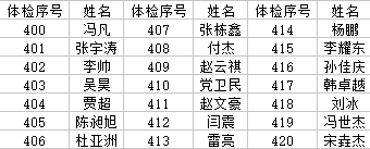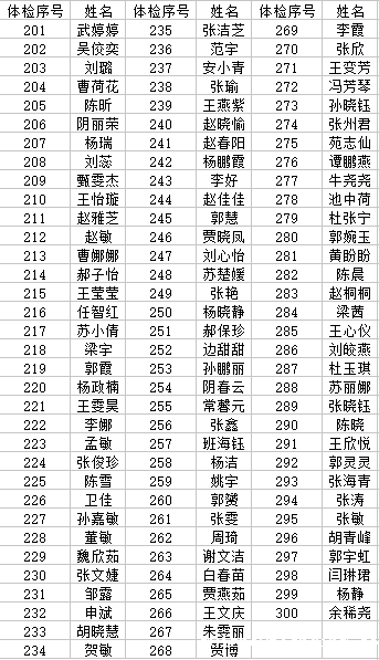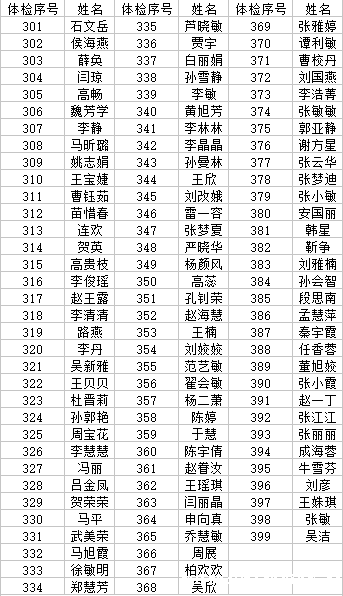4、各位考生在体检现场听从相关负责的老师安排,遵守秩序(专升本、对口升学考生体检序号详见下文),1-100号赵世鹏老师负责,101-200号高勇强负责,201-300号赵蕊老师负责,301-420号、对口升学1号由许文强老师负责。