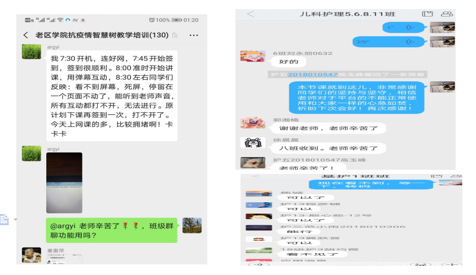 闫宏丽老师采用“ 翻转课堂见面课 ”的方式讲授《 中医内科学 》课程。课后,闫老师和群里的同行们及时做了交流,她说:网络拥堵现象出现时,我及时启动了微信群直播互动功能,顺利地完成了开学第一课。