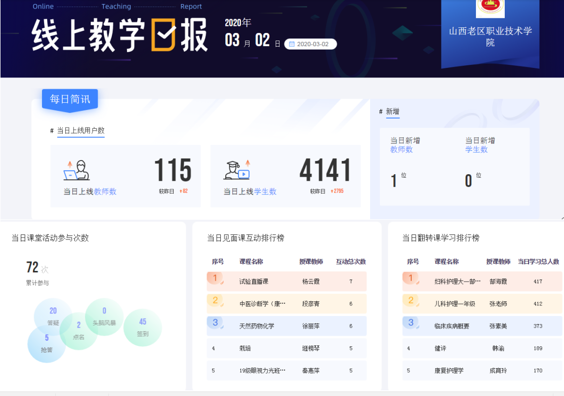 对于学生线上学习情况,教务处于第一周教学结束后设计了调查问卷。本次问卷发放175份,实际收回118份,其中有效问卷为118份。问卷分析结果表明:95%的学生满意在线网络授课方式,同学们普遍认为可继续推进;有95%的学生认为除选择智慧树平台外,还应结合其他网络平台(如雨课堂、钉钉课堂或抖音),以提升网络教学通畅度和直观性。在调查中也发现少数学生由于受地域条件所限,网络速度无法满足在线学习要求,出现卡顿和断线现象,建议教师应多借助班级微信群和QQ群,预先通知并发布课件与练习等教学资源,从而落实在线教学班级“一个学生都不能掉”要求。另外,通过学生的讨论或回帖,教师的辅导与答疑,以及直播课堂形成的课堂报告(参看以下截图)看,第一周的教学与学习情况良好。