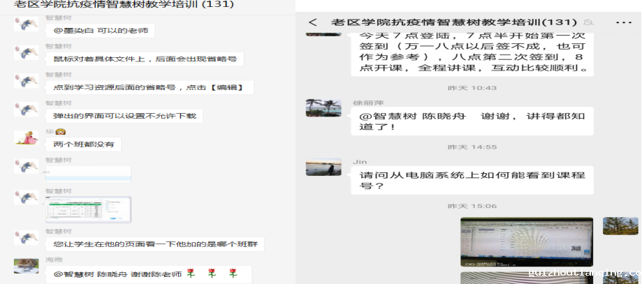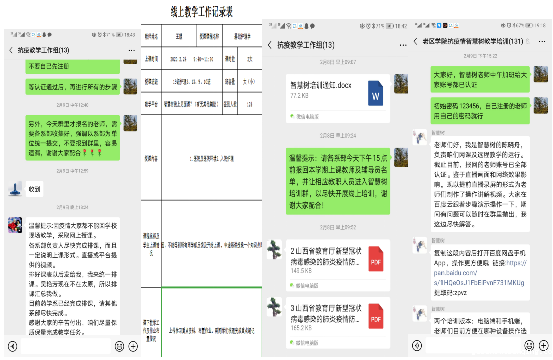 2. 教学平台使用及运行情况。应广大教师要求,目前主要以以智慧树教育教学平台为主,结合中国大学MOOC和超星学习通等平台,以及微信等社交工具,作为线上教学工作的途径,为保证线上教学组织有秩序、教学质量有保障、教学过程有监督,对“抗疫教学工作组”、“老区学院抗疫情智慧树教学培训组”两个工作群采取认证制,由教务处统一负责管理。采取院系两级制对教师培训与备课、教学组织与管理工作等进行督导检查,维护教学秩序稳定正常。